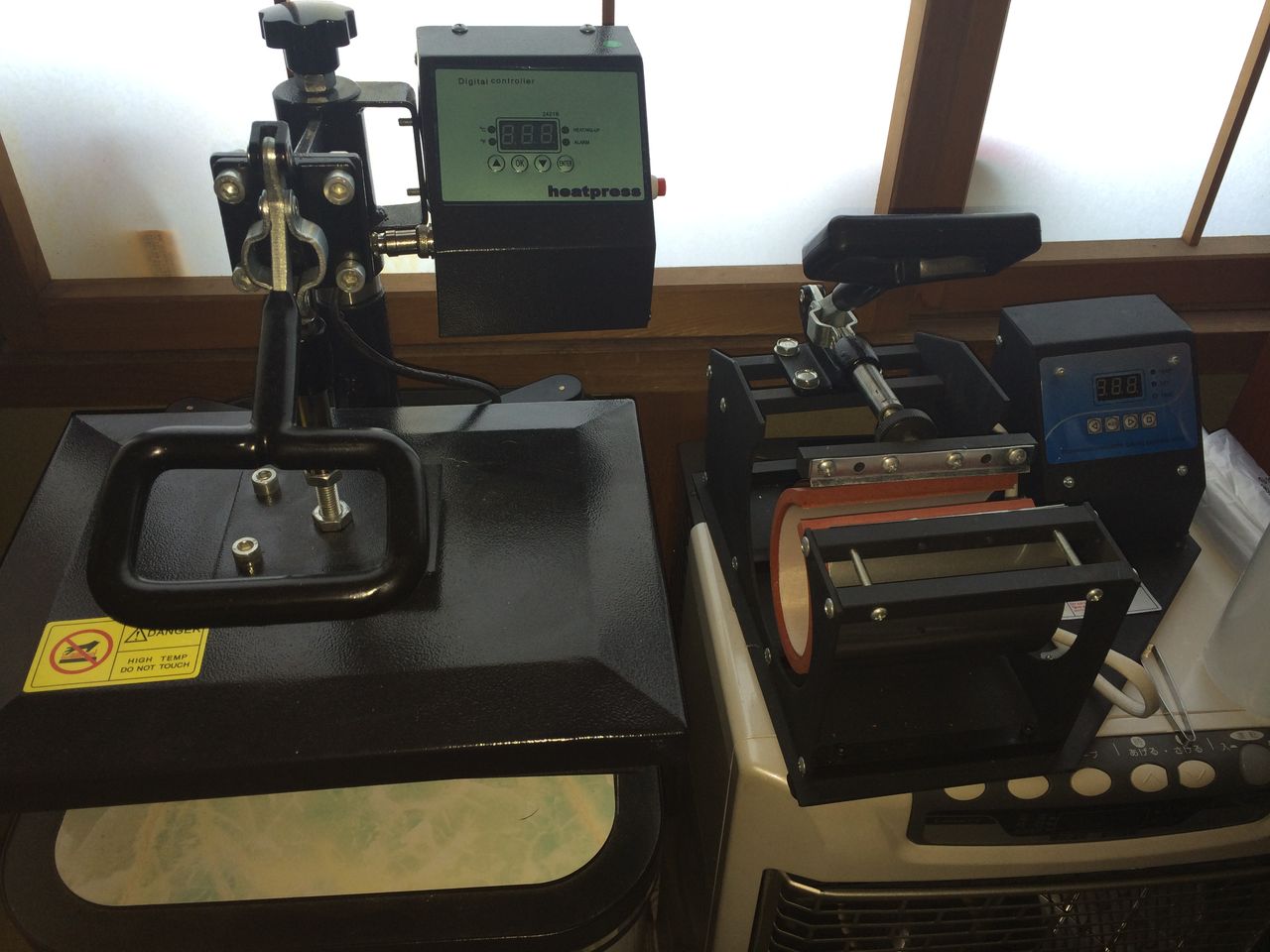 シャツやタオル等用のA4サイズまで平面転写機(左)が2万円くらいで、マグカップ用(右)が1万4千円くらいでした。