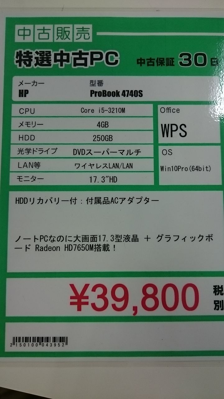 さて本題です。本日は当店の中古PCコーナーからオススメのモノをご紹介します。
