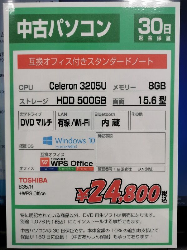 Celeron 3205U/MEM 8GB/HDD 500GB/DVDマルチ/Wi-Fi/15.6型液晶/in10 Home