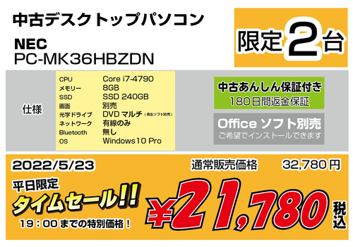 本日のタイムセール! 5/23(月) 中古デスクトップ!