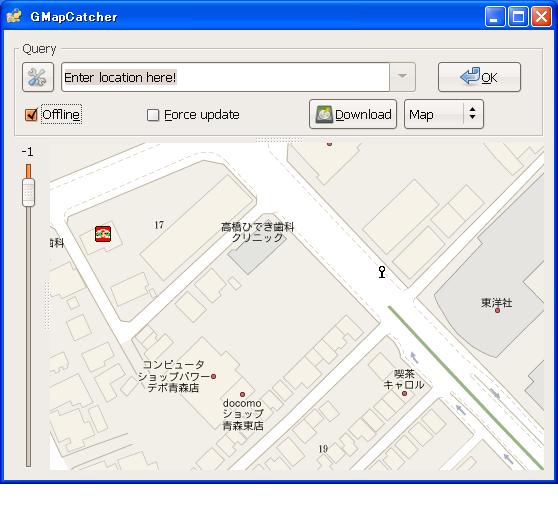 Gmapcatcherを起動すると、mapが表示されます。拡大縮小はマウスのホイールボタングリグリでOK。移動はドラッグという一般的な地図サービスと操作は一緒です。