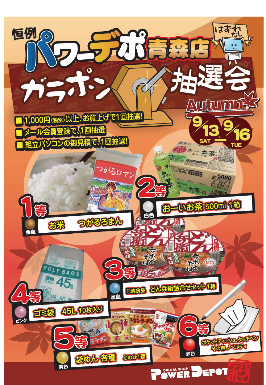 2014年09月12日 シルバーウィークわいわいイベント 明日13日よりの三日間がらポン抽選会を開催。期間中店頭で1000円以上お買い上げのお客様はがらポン抽選にご参加頂けます。↓↓がらポン抽選会詳細はコチラ↓↓ちなみに…ご購入以外にも、がらポン抽選参加のチャンスが…パワーデポ青森店より週末イベント情報をお送り致しました。 < 前の記事次の記事 > トラックバック