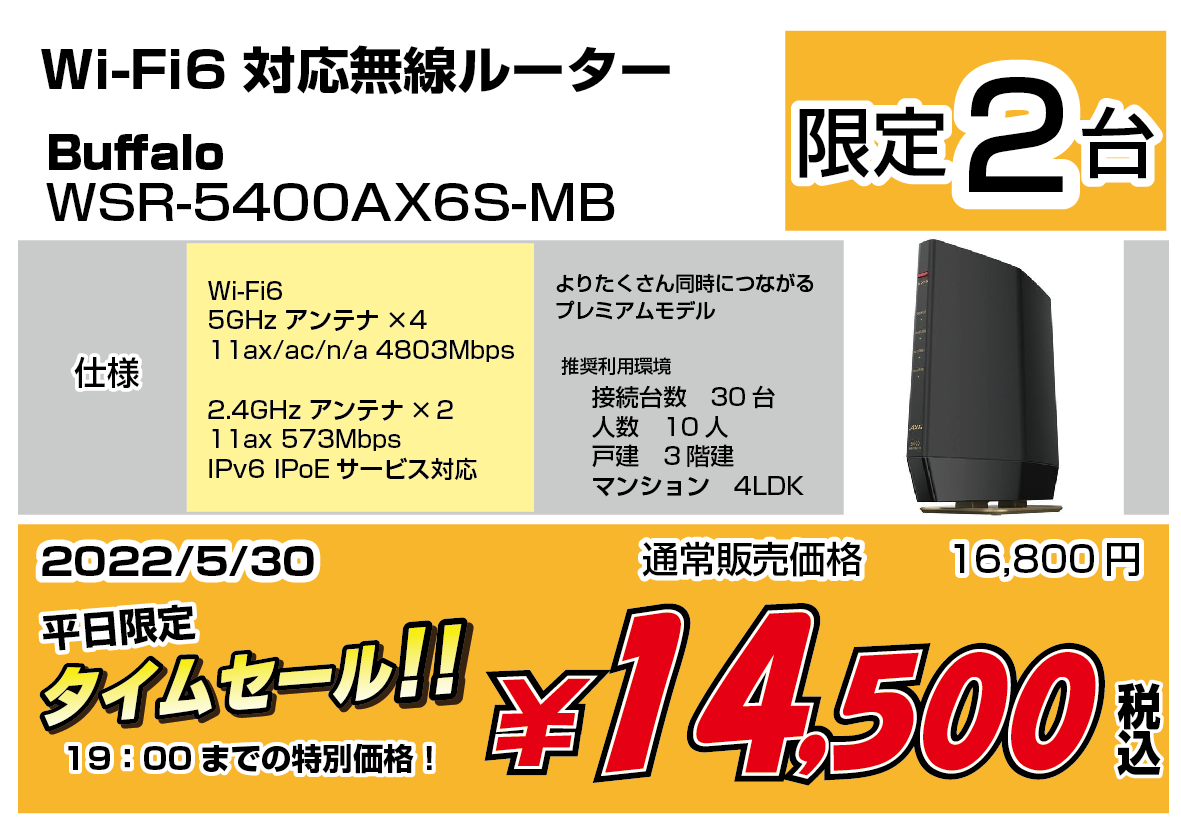2022年05月30日 本日のタイムセール 5/30 Wi-Fi6プレミアム無線ルーター 17:00開始!本日のタイムセールはこれ!Buffalo Wi-Fi6対応無線ルーター当店通常価格16,800円税込タイムセール価格14,500円税込本日17:00開始です!!閉店の19:00まで!!合わせてポイント3倍も開催!6/1から開始の【青森市プレミアム付商品券】当店は共通券・応援券どちらも使えます!青森市プレミアム付商品券、6/1~8/31まで! < 前の記事次の記事 >