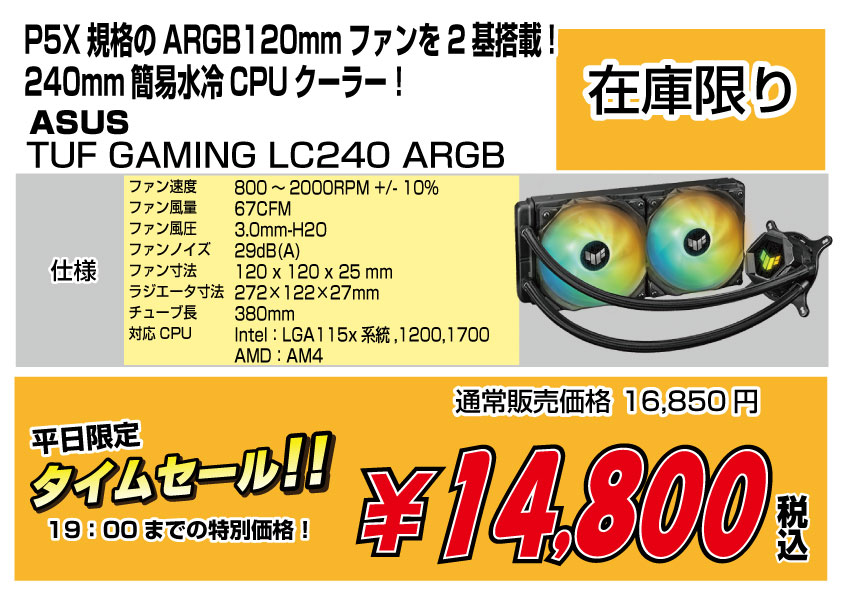 2022年05月31日 本日のタイムセール 5/31 ゲーミングPCにオススメ!簡易水冷! 17:00開始!本日のタイムセールはこれ!ASUS ARGBファン2基付属の240mm簡易水冷CPUクーラー!当店通常価格16,850円税込タイムセール価格14,800円税込本日17:00開始です!!閉店の19:00まで!!合わせてポイント3倍も開催!6/1から開始の【青森市プレミアム付商品券】当店は共通券・応援券どちらも使えます!青森市プレミアム付商品券、6/1~8/31まで! < 前の記事次の記事 >