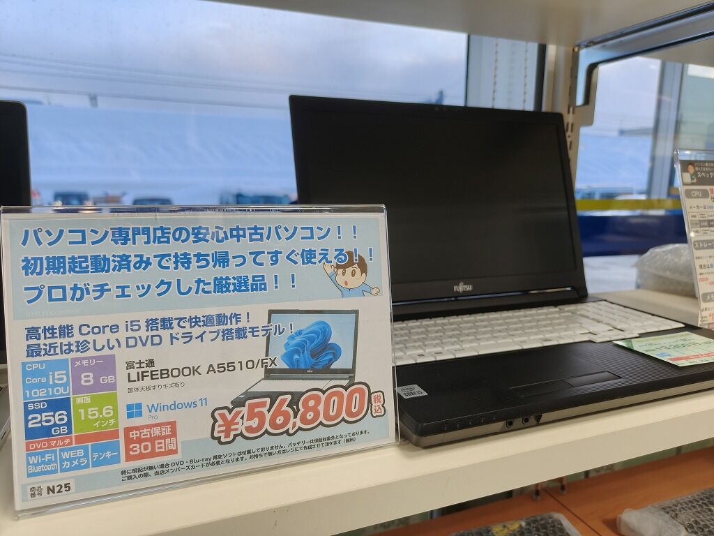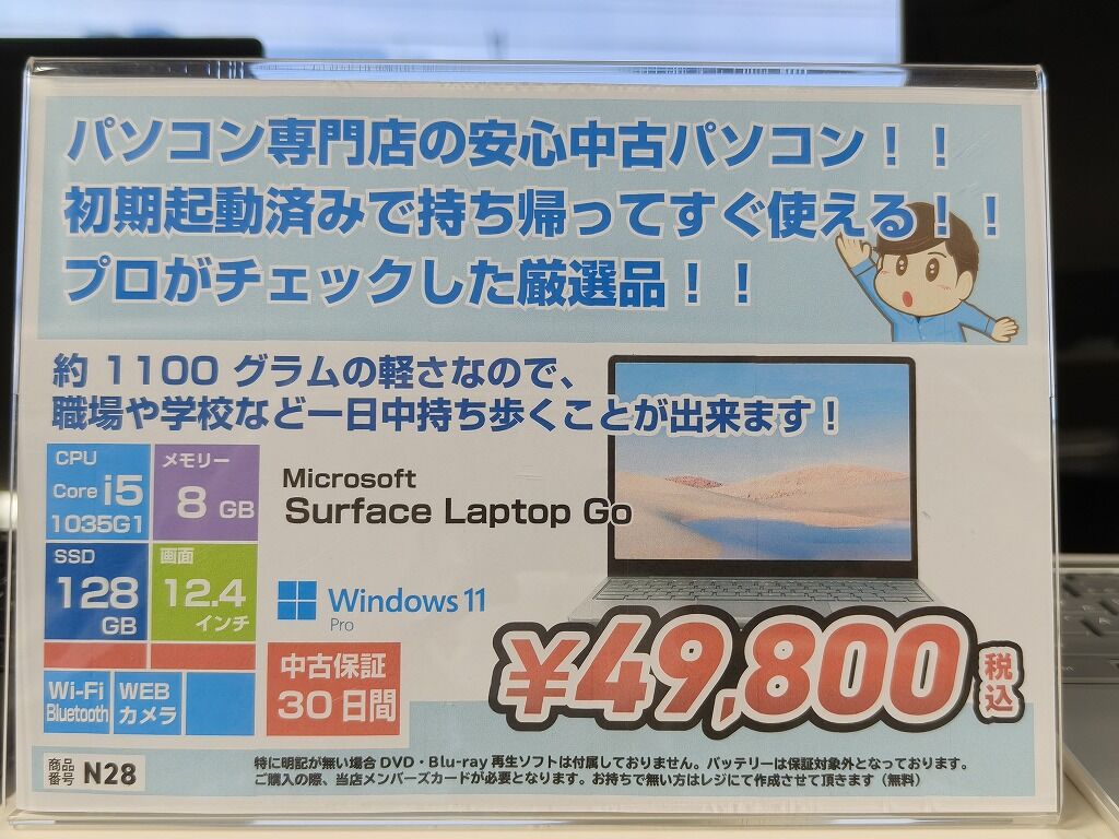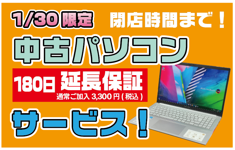 2026年01月30日 本日(1/30)限定! 中古パソコンご購入の方へ! 本日 1/30 限定!閉店時間19:00までの間、中古パソコンをご購入いただいた方へ、180日延長保証(通常税込3,300円)をサービスします!!もう時間あまりないのですが、お仕事帰りに寄ってください!!中古ノートパソコンは安い機種だと3万円台からありますよー!ご来店お待ちしております!!! < 前の記事次の記事 >